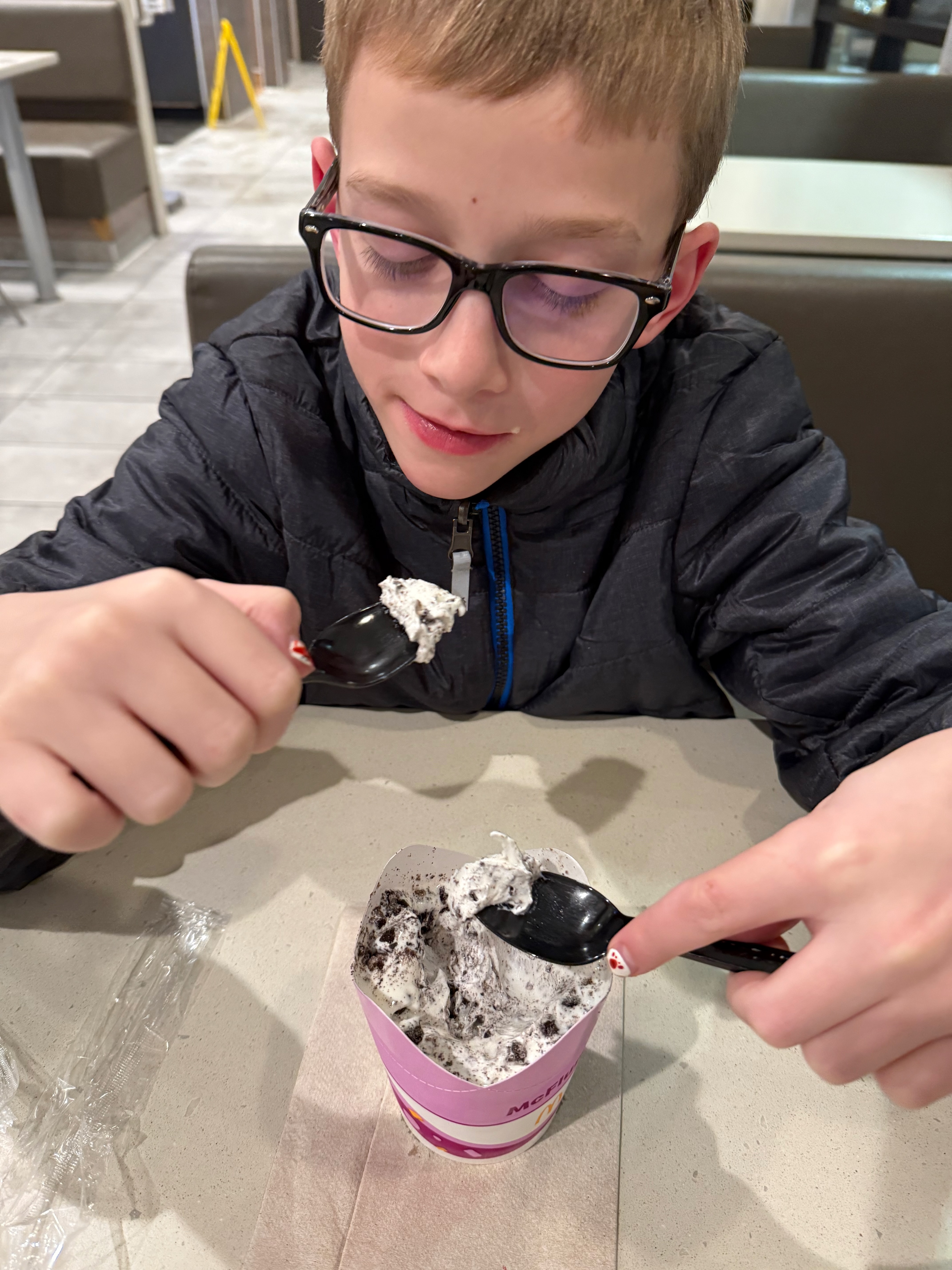 This week we were pressed for time and had to have a fast dinner so we ended up at McDonald's. Jack convinced me that although it was single digit temperatures outside it was still a great time to have some ice cream. He initially got the wrong kind and was upset. Then he composed himself, got up and went to the counter and proceeded to tell them that he had ordered a different flavor. They made him a new one that was what he wanted and he got to work.
