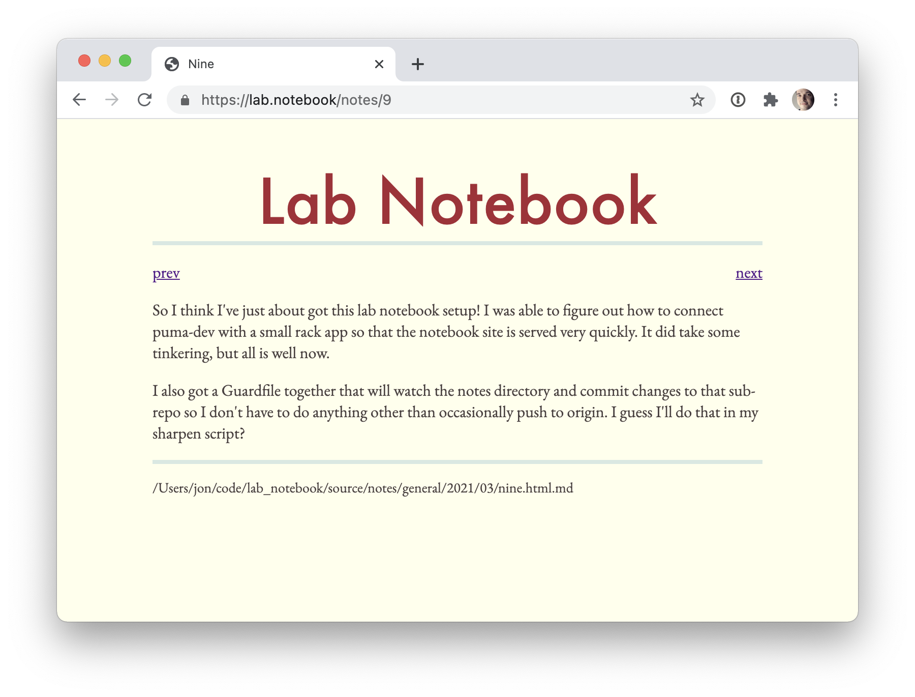 I wanted to be able to use a normal-looking URL to access my lab notebook so I did some research and found puma-dev which allows one to route local servers using particular TLDs.